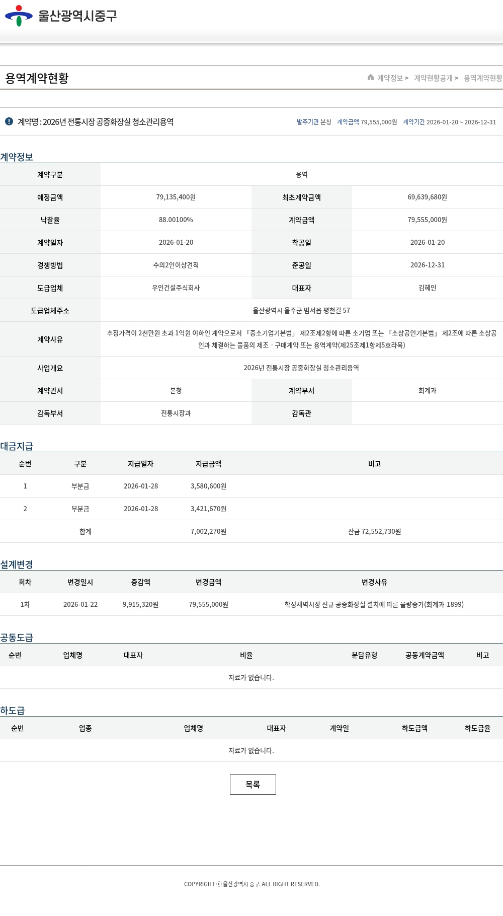 | 1차 | 2026-01-22 | 9,915,320원 | 79,555,000원 | 학성새벽시장 신규 공중화장실 설치에 따른 물량증가(회계과-1899) |