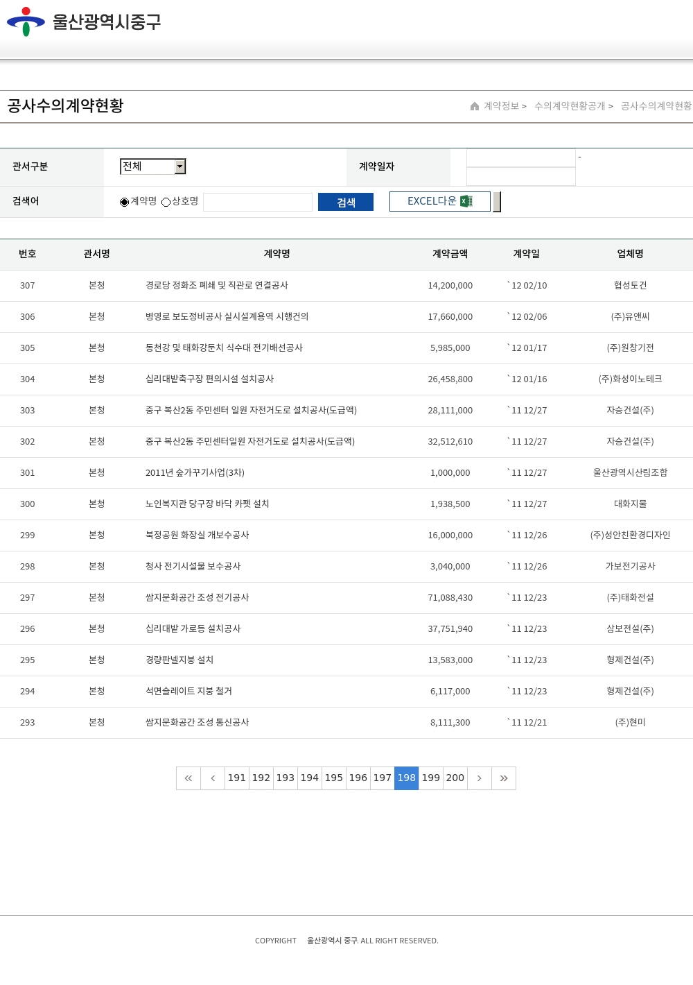 | 299 | 본청 | 북정공원 화장실 개보수공사 | 16,000,000 | `11 12/26 | (주)성안친환경디자인 |