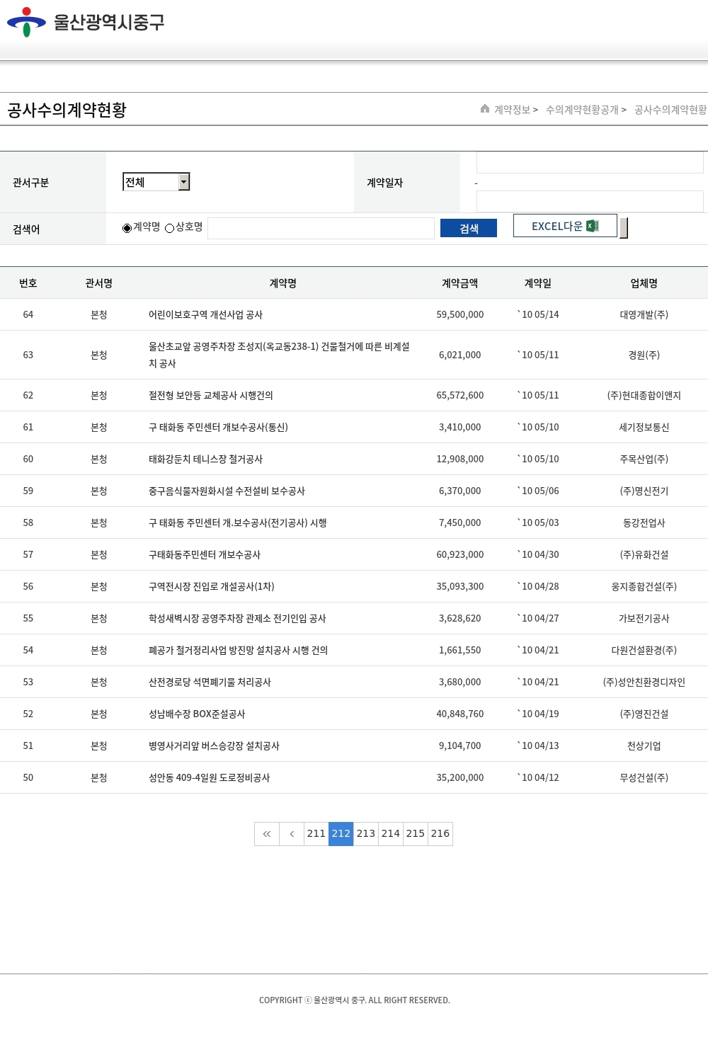| 48 | 본청 | 반구동 서원배수장 일원 외 5개소 재포장공사 | 11,370,000 | `10 04/08 | 대성토건(주) |