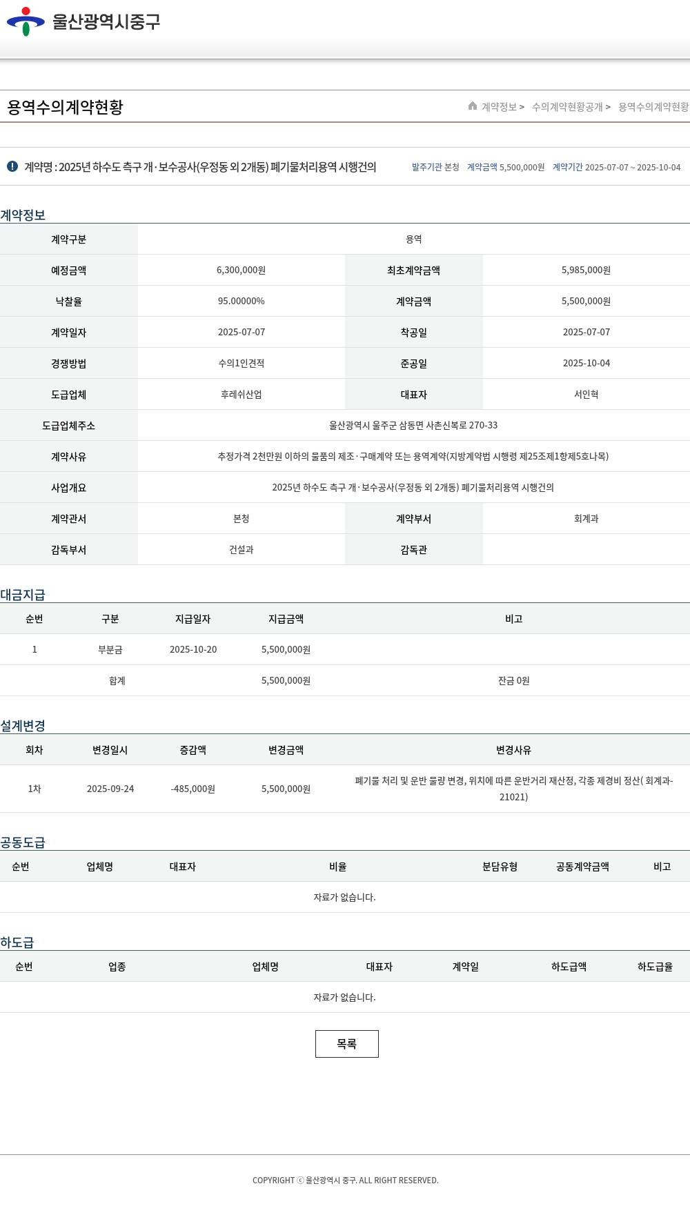 | 1차 | 2025-09-24 | -485,000원 | 5,500,000원 | 폐기물 처리 및 운반 물량 변경, 위치에 따른 운반거리 재산정, 각종 제경비 정산( 회계과-21021) |