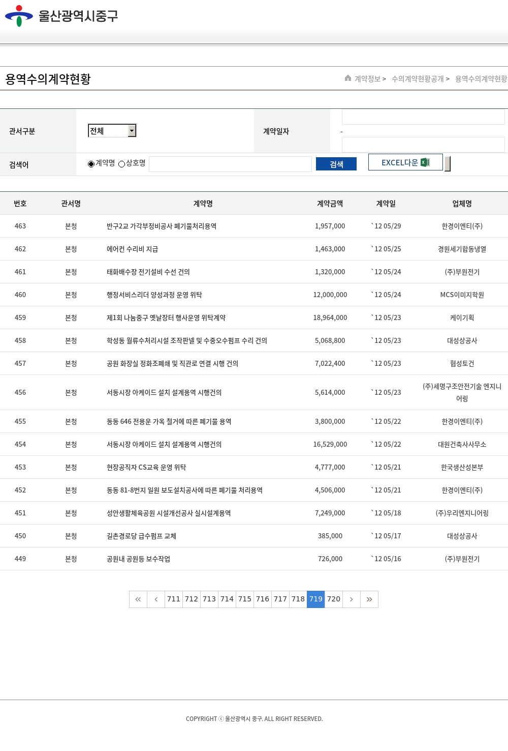 | 66 | 본청 | 태화시장 내 폐기물처리용역 | 2,580,000 | `10 04/22 | 용신환경개발주식회사 |