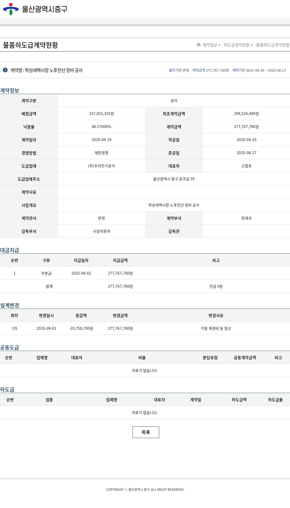 | 1차 | 2025-09-01 | -20,758,700원 | 277,767,780원 | 각종 제경비 등 정산 |