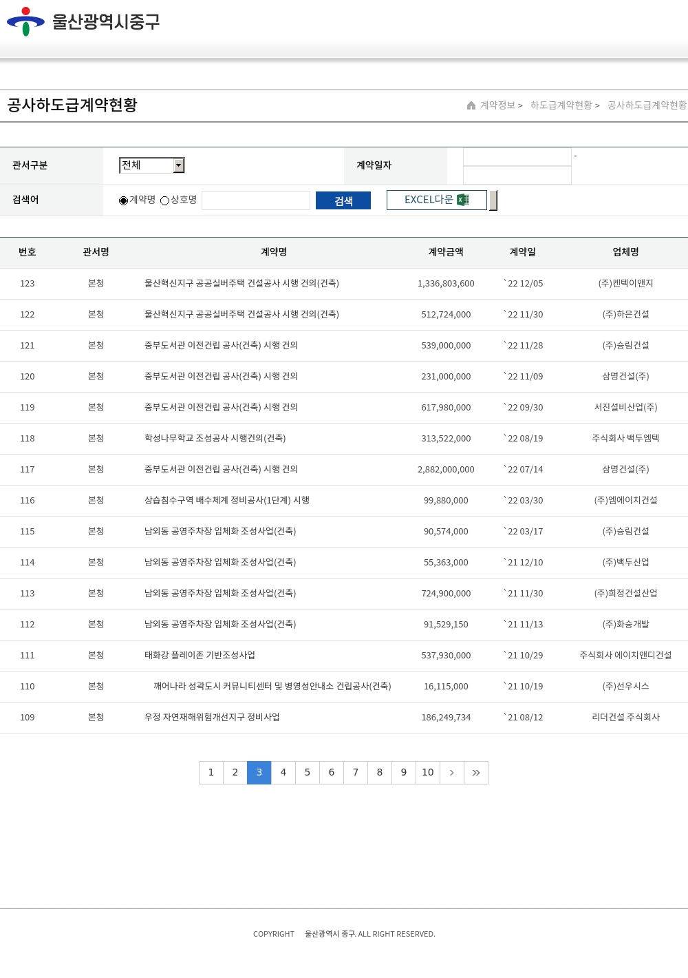 | 111 | 본청 | 태화강 플레이존 기반조성사업 | 537,930,000 | `21 10/29 | 주식회사 에이치앤디건설 |