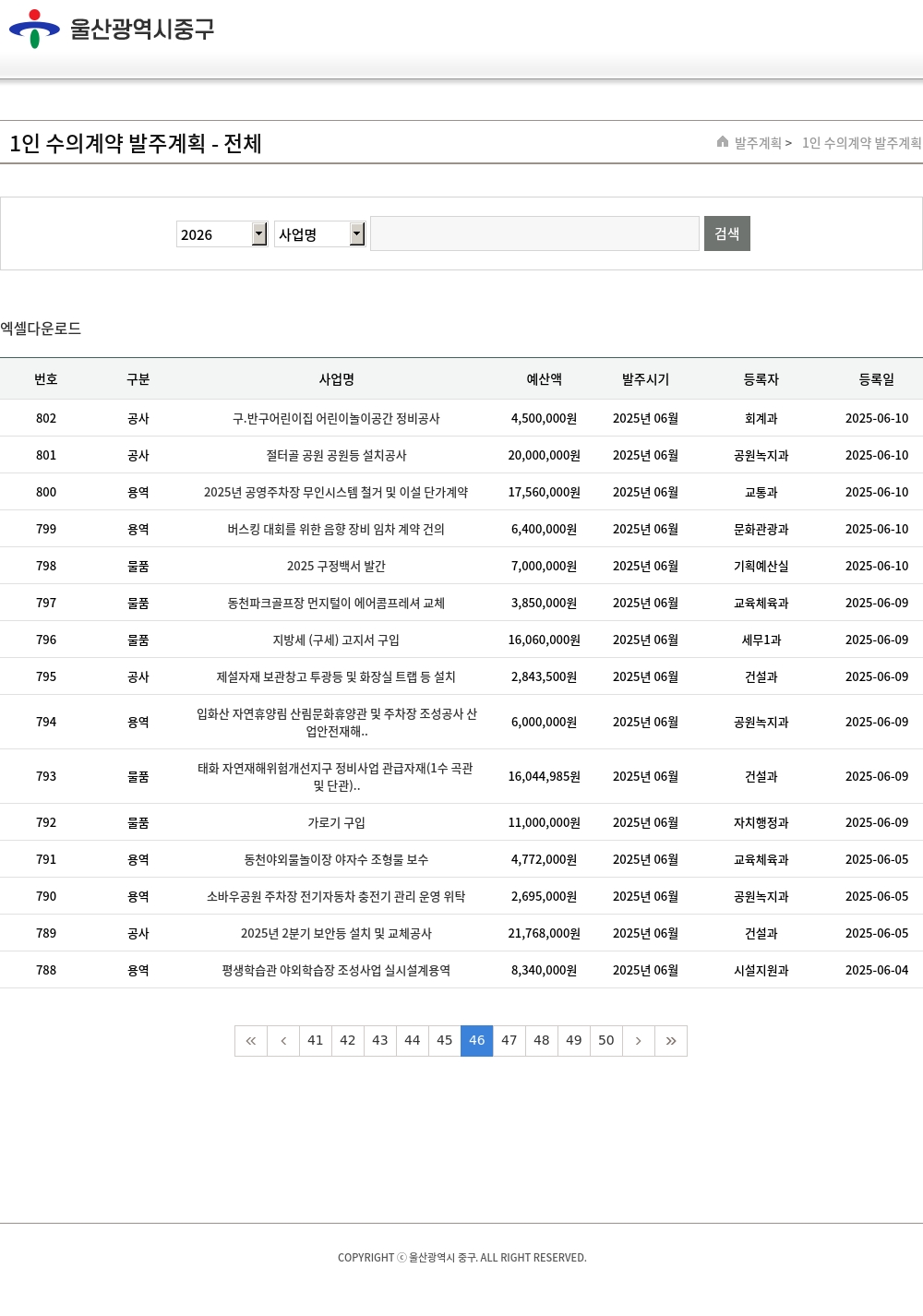 | 589 | 물품 | 종량제봉투 동판 제작 | 2,763,000원 | 2025년 02월 | 환경미화과 | 2025-02-21 |