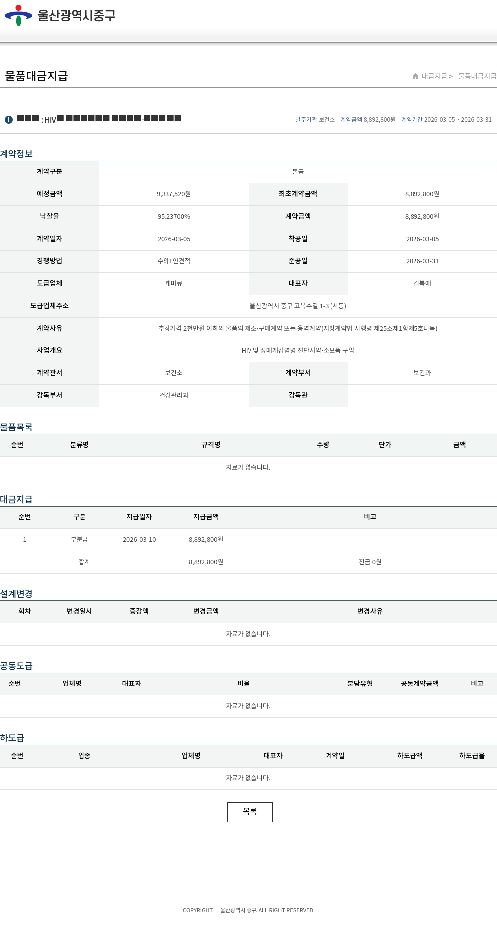 | 예정금액 | 9,337,520원 | 최초계약금액 | 8,892,800원 |