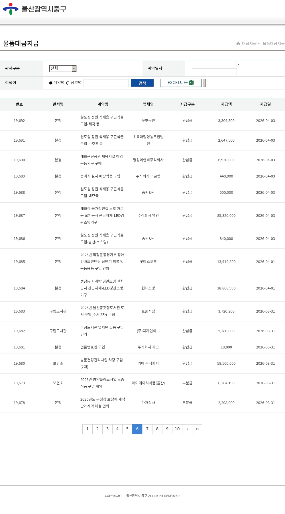 | 19,658 | 본청 | 태화강 국가정원길 노후 가로등 교체 공사 관급자재-접속단자대 | 미성산업 | 완납급 | 2,242,240 | 2026-03-23 |